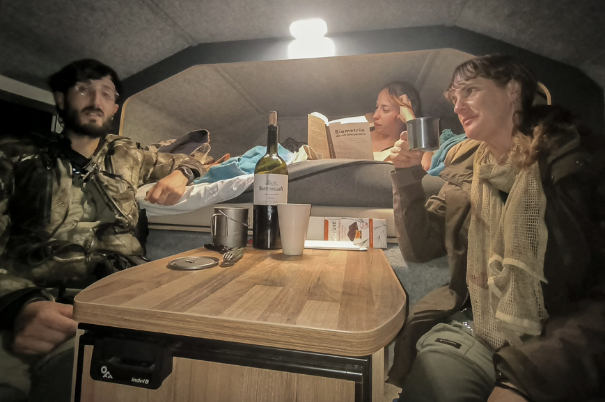 Allí, en ese oasis de un solo árbol, lo dimos todo. Sacamos la última reserva de vino para acompañar a una colección de ristras de morcillas, criollos y chorizos que Néstor asaba al carbón. Era un poco contrarreloj. El horizonte, por momentos, se iluminaba totalmente con los rayos de una terrible tormenta. El viento azotaba y traía las primeras gotas y así La Numenius se estrenó como salón para la celebración de lecturas y banquetes.