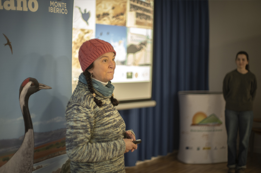 ¿Serán nervios de verdad? Seguro, pero no por ser inexperta. Ella es veterana. Tiene cientos de charlas, ponencias y talleres a cuestas y mucho mundo en su mochila. Con sus grabaciones y narraciones sonoras se ha enfrentado a auditorios mucho más difíciles que el salón de actos del Ayuntamiento de Corral Rubio, lleno de pajareras y pajareros, con el cartel de “no hay billetes” colgado en la puerta. Yo apuesto por el nervio de la perfección, que lo lleva dentro y le aflora minutos antes y hasta que el primer sonido e imagen sale correctamente del ordenador. Mira a un lado y a otro, busca el okey de Lucas, responsable primero de este festival. Un más gesticulado que susurrado “¿podemos apagar estas luces?”. Y allá va Eloísa Mateu con su migración sonora. Comienza con los reclamos solitarios de las grullas en algún lago más allá del Círculo Polar Ártico, filtrado por el extraño eco opaco de la madera de los bosques de la taiga, y termina con el silbido remoto de un pastor del Sahel tratando de imitar, quizá, a una alondra ibis. En medio un viaje de miles de kilómetros donde las aves se concentran y vuelan camino de sus refugios invernales. La media veda, el sonido alarmante del aeropuerto demasiado cercano y que terminará por comerse el remanso de las aves en migración y los vientos del estrecho: los peligros del viaje. Todo está en ese documental sonoro.