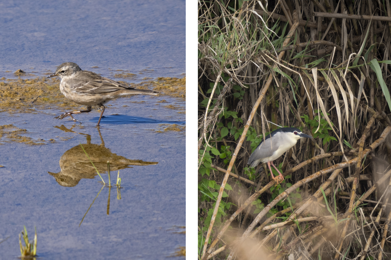 Las cañas bordean el humedal, principalmente en el lado oeste, y se tiene muy buena vista sobre ellas, especialmente durante las primeras horas de la mañana. Ese es el momento que ofrece las mejores luces para la observación, aunque según avanza el día puedes desplazarte a la parte horizontal de la T y trabajar los extremos oriental y occidental de Soto del Lugar. Aunque la distancia de observación desde allí no será tan pequeña como desde el carril que corta la laguna, son puntos muy interesantes de observación.